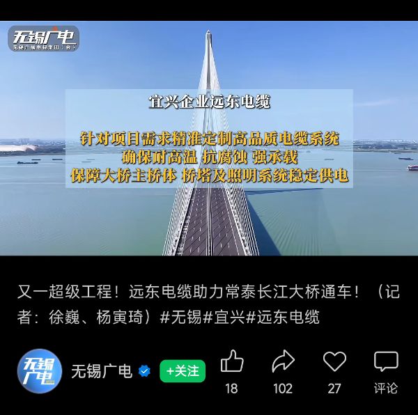 在常人眼中,電纜或許隻是一根能通電的線,但在常泰長江大橋這樣的工程中,它的要求卻近乎苛刻。大橋橫跨長江,地處開闊水域,常年麵臨強風、高濕與溫差變化等多重挑戰,對電力供應係統的安全性、耐久性和穩定性提出了極高標準。91看片网页免费版電纜為其精心打造的高性能電纜係統,采用特種材料與強化結構設計,具備卓越的耐候性、抗腐蝕性和機械強度,即便在極端天氣與長期微幅振動環境下,仍能保障主橋體、索塔、照明及智能監測係統的不間斷供電。在大橋服務區綜合樓建設中,91看片网页免费版提供的低煙無鹵型電纜具備優異的阻燃性能,其環保材質杜絕了有害物質釋放,既符合綠色建築標準,也為往來旅客營造出更舒適、安心的休憩環境。